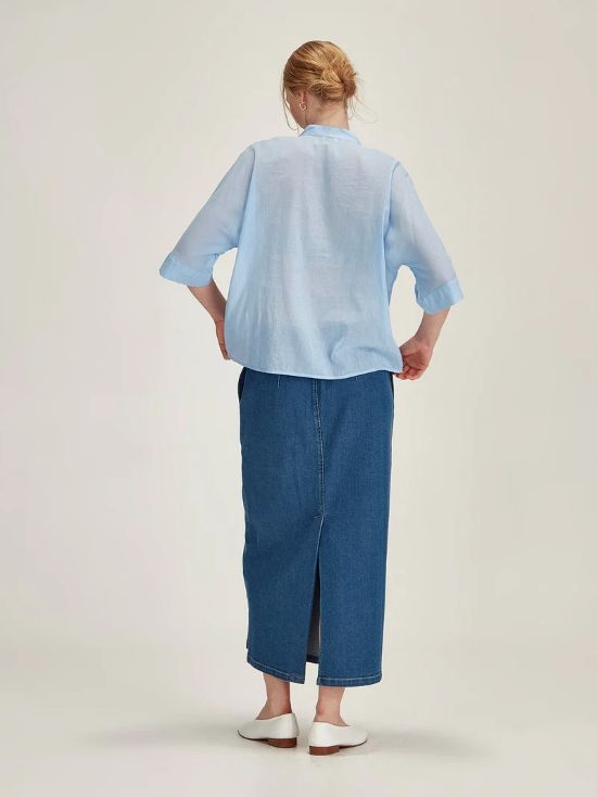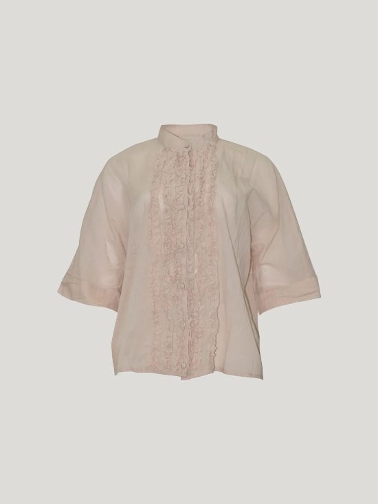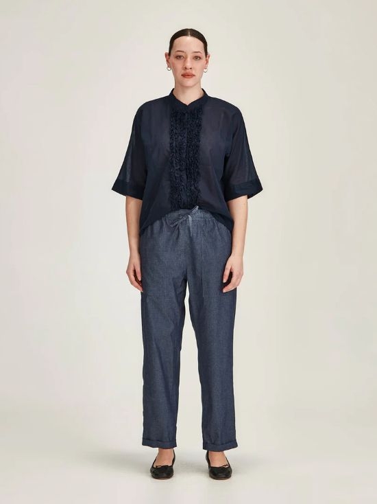 An injection of light-weight shirting, ideal for layering, all crafted in an organic cotton voile. The Sasha is a boxy shape, short sleeve shirt with ruffle detailing.